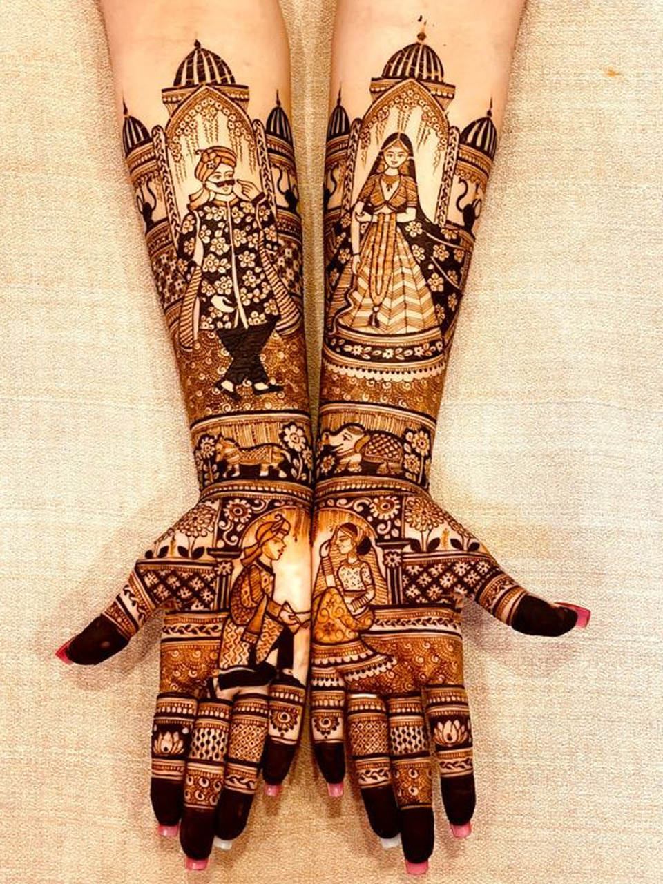 Crafted by Alok – a leading Mughlai Mehndi Artist in Delhi NCR, each design combines delicate floral patterns, paisleys, and fine mesh detailing that flows beautifully across the hands and arms. The intricate work ensures full coverage while maintaining clarity, balance, and symmetry — giving you a truly majestic look that stands out in every photograph.